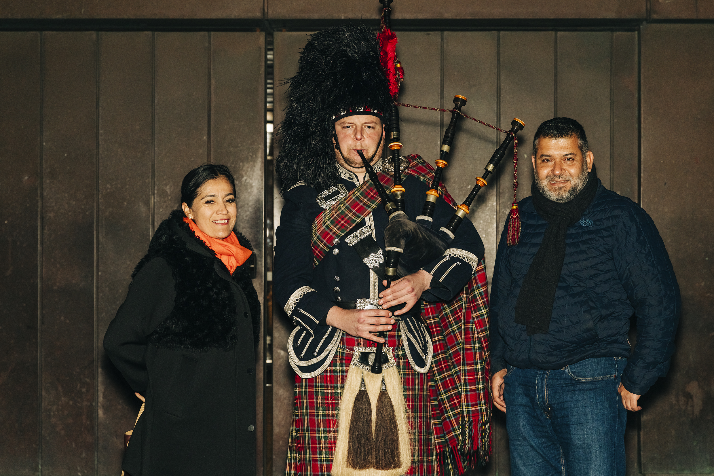 The reception begins with the moving sound of a Scottish bagpiper, accompanied by a photocall to capture unforgettable moments.